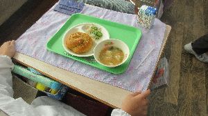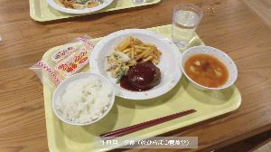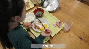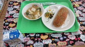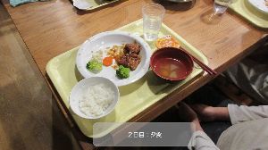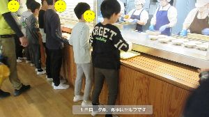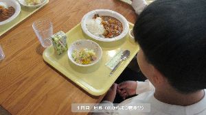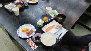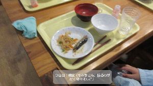 【1日目:夕食。食事はセルフです。ご飯や汁物は班ごとに配ります。ご飯はお替りがありました。】