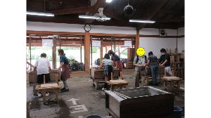 【2日目:焼き板(どうすればしっかりと火をつけられるのか、試行錯誤しながら班で協力して活動しました。板の表面を焼き、金ブラシで研ぎ、雑巾で磨き上げました。】