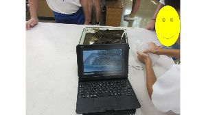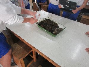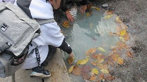 10月24日 5年生 理科、流れる水のはたらき。タブレットに録画しながら観察。