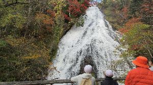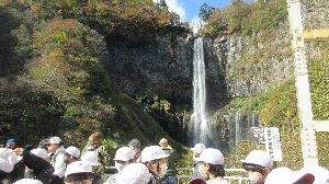 【1日目】湯滝、紅葉の木々に飾られた滝を眺めました。