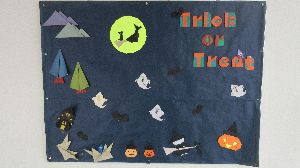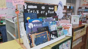 10月31日 泰平小学校図書館。ハロウィンの飾りつけ、ボランティアの皆様、ありがとうございます。