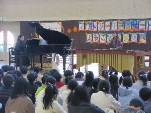 12月18日 アウトリーチコンサート「発見!音楽の魅力 Swing Note♪~わくわく!聴いてみよう!マリンバってどんな楽器?~」1~3年と4年~6年に分かれて、全校で聴きました。