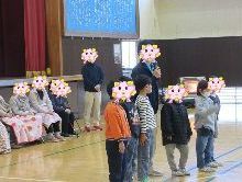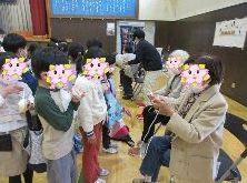 12月19日 1年生「むかしあそびのかい」。デイサービスの方を招き、こま、けん玉、お手玉、だるま落としの遊びを教えていただきました。