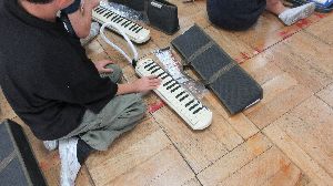 9月19日 1年生 鍵盤ハーモニカ教室。講師の先生に上手な吹き方、置き方などを教えていただきました。