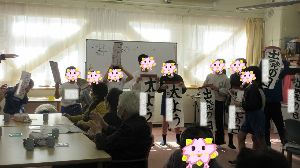 1月26日 ふれあい委員会が呼びかけて希望者を募り、書きぞめの作品を2階に上がるのが難しいデイサービスの方に見てもらいました。
