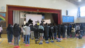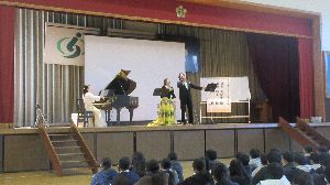 1月30日 6年生 未来くる先生、オペラ歌手とピアニストで作曲家の先生を招いて、夢をもつこと、好きなことに取り組むことの大切さを学びました。歌唱指導もしてくださいました。