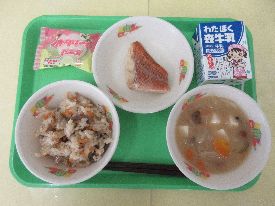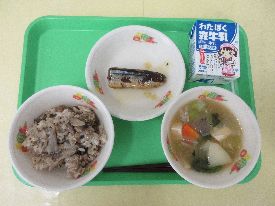 1月27日(水) まいたけごはん さんまのオレンジ煮 みそけんちんじる 牛乳