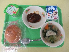 1月26日(火) セルフハンバーガー(こどもパン、デミグラスハンバーグ) ラビオリスープ ヨーグルト 牛乳